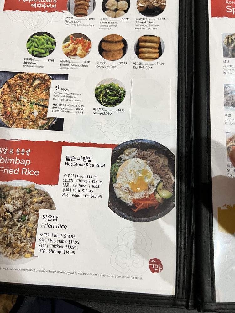 Soora is a Korean restaurant located in West Bloomfield Township, MI, offering a casual yet classy dining experience. With a focus on traditional Korean flavors, Soora provides a variety of dishes from bibimbap to fried rice. The menu includes options for vegetarians and meat-lovers alike, ensuring there is something for everyone. Highlights include the flavorful Beef Hot Stone Bowl bibimbap and the savory Seafood Pancake appetizer. The restaurant also offers convenient utilities such as reservations, delivery, and takeout, making dining at Soora a breeze. With its welcoming atmosphere and delicious dishes, Soora is a great choice for a group dinner or a family outing. Whether you're a Korean food enthusiast or new to the cuisine, Soora's menu is sure to impress with its authentic flavors and quality ingredients.